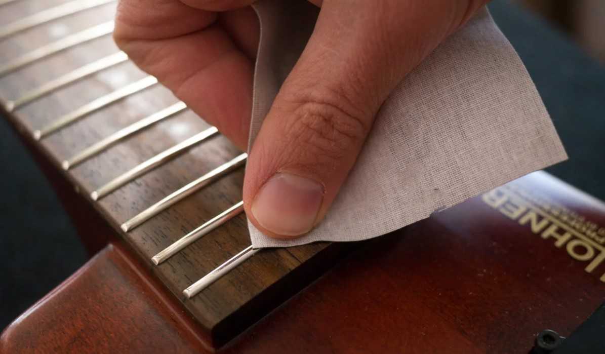 Гриф между ладами лучше всего протирать влажной микрофиброй. Использовать для очистки дерева спирт стоит лишь точечно и в случае очень сильных загрязнений, так как это средство пересушивает древесный материал. После первичной обработки накладке дают высохнуть и, в зависимости, от наличия или отсутствия лакового покрытия, наносят завершающий уходовый состав.