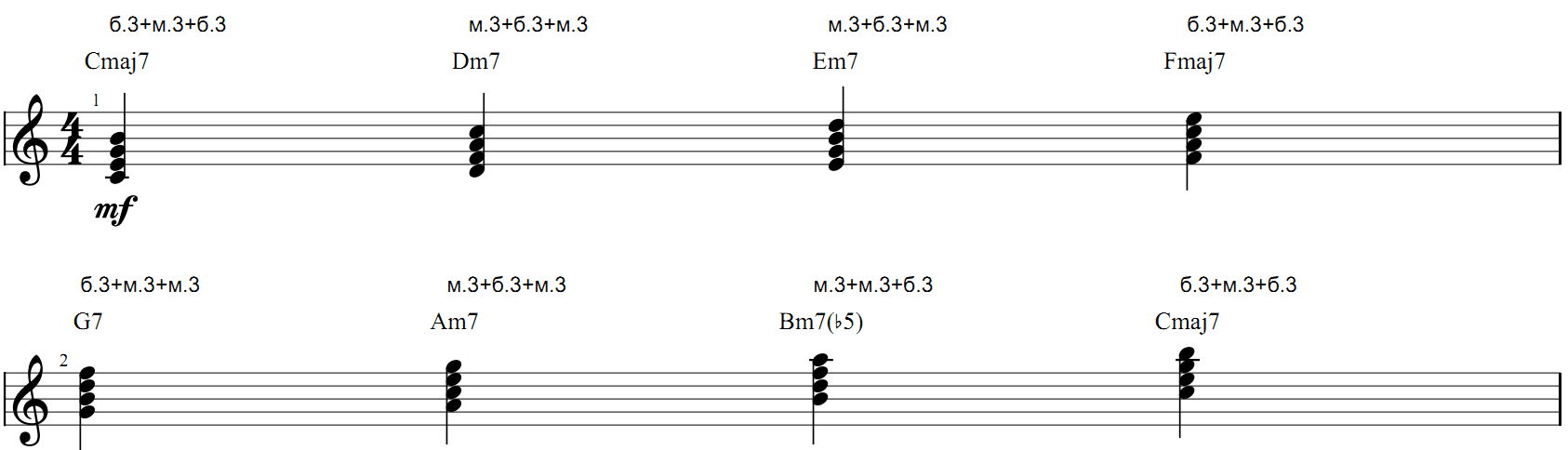 Как видим, получились все аккорды состоящие из четырёх звуков, и имеющие в своём названии цифру 7.
