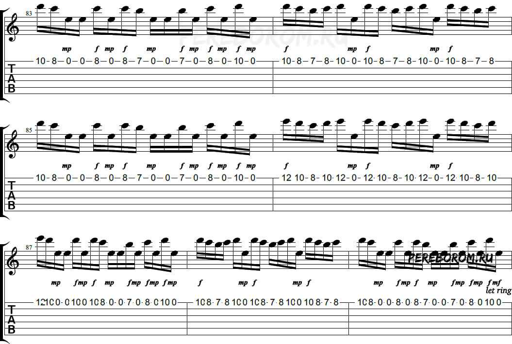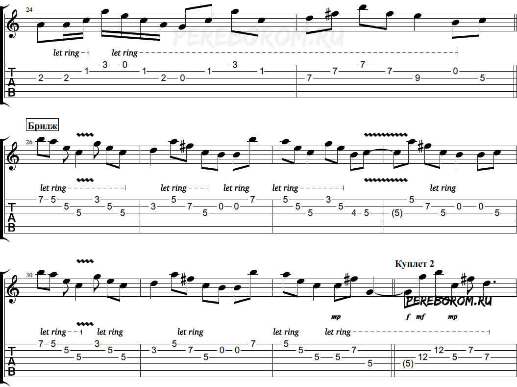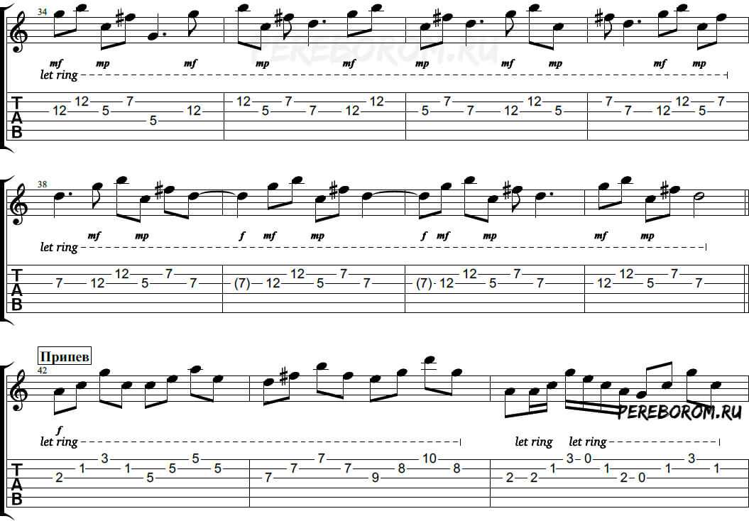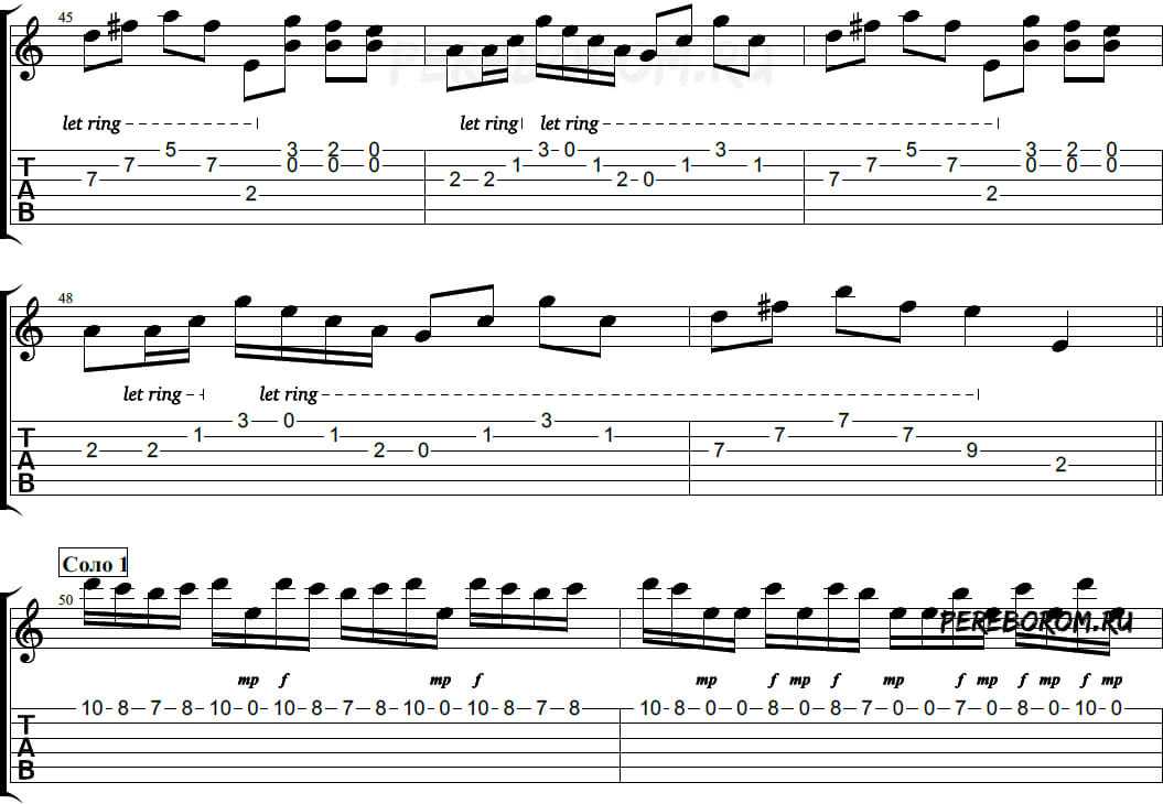 В первом куплете используются одинаковые ноты, которые играются по пять штук (послушайте сольную партию отдельно). Достаточно выучить, что на 12 ладу мы ставим безымянный на 3 струну, а мизинец на 4. Потом мы двигаем их на 7 лад. Указательным пальцем играем 5 лад на третьей струне. В 10 такте можно поставить малое баррэ на 5 лад 2-4 струны.
