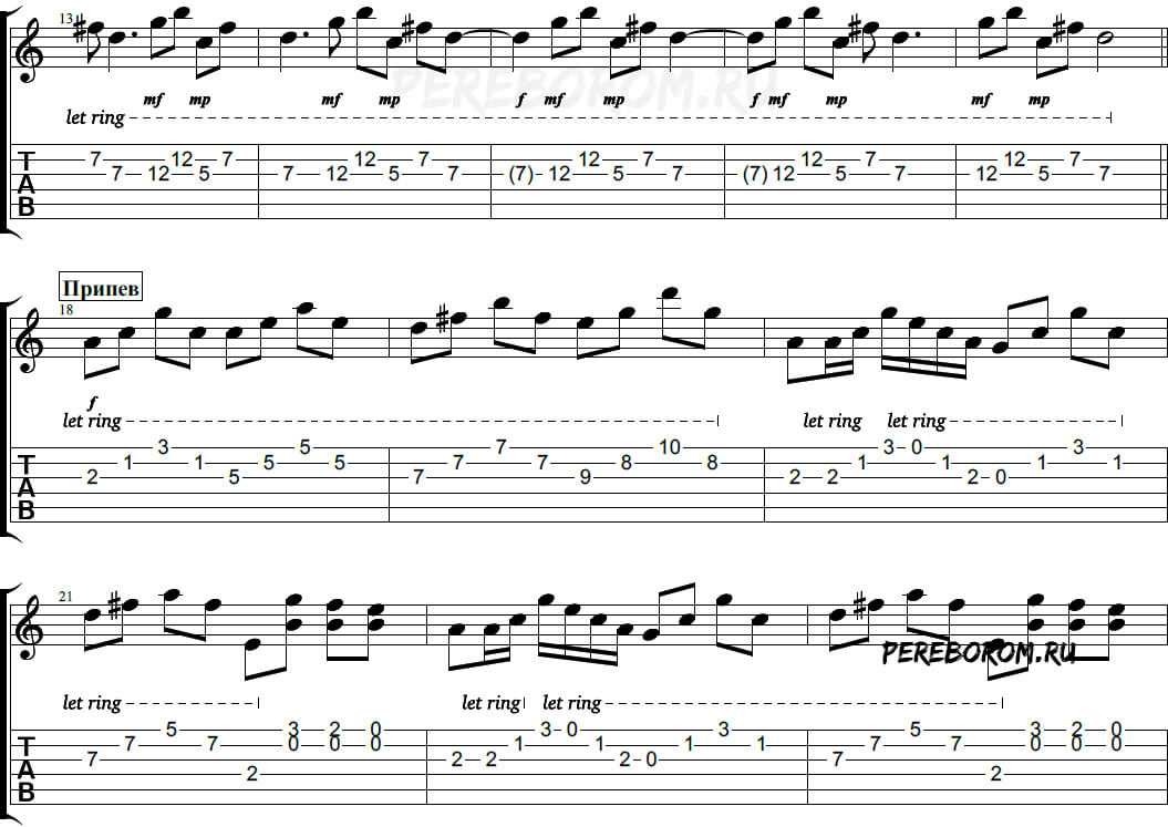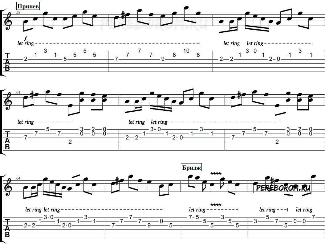 Во вступлении Пачка сигарет на гитаре мелодия почти всегда повторяет звуки аккорда. Зажмите аккорды с баррэ (см. пункт «Тональность») и поиграйте предложенные сольные фрагменты. Здесь мы поступим проще и зажмём малое баррэ на три струны (например, во 2 такте). При этом безымянным можно играть мелодию (7 лад). Тоже самое используется в 4, 5, 6 тактах. Знак «Let Ring» — «пусть звучит». Значит ноты под штриховой линией заглушать не нужно. Внимательно посмотрите, например, на 4 такт – при исполнении отрезка «4-5» предыдущие ноты «3-5» нужно снять – иначе произойдёт нежелательное наслаивание звуков