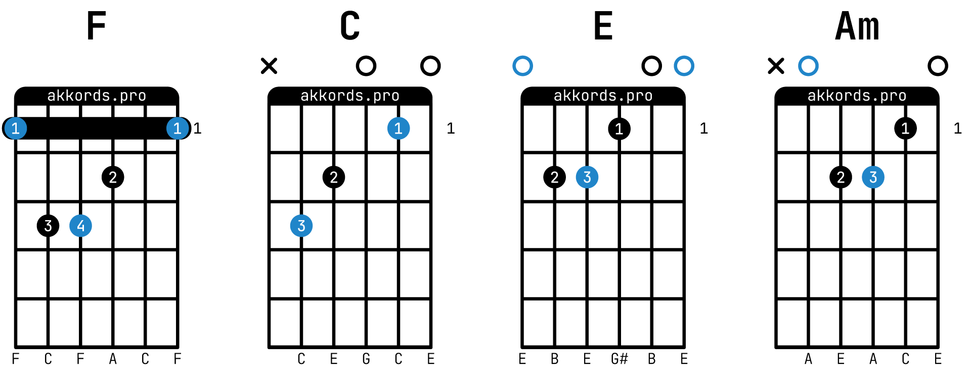 К сожалению тут есть один сложный аккорд – это F.Но вы можете его сыграть упрощенным способом, не баррэ. Так:либо так: