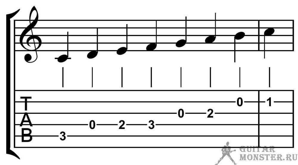 На нашей аппликатуре самая толстая, шестая струна изображается внизу, а самая тонкая первая – вверху.
