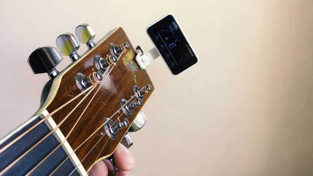 Тюнер в форме клипсы чаще всего пристегивается к голове грифа акустической гитары (или классической). В данном случае высота ноты определяется за счёт частоты вибраций деки самой гитары .