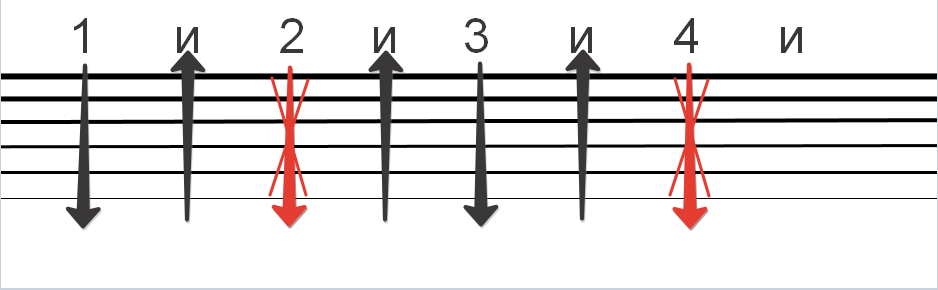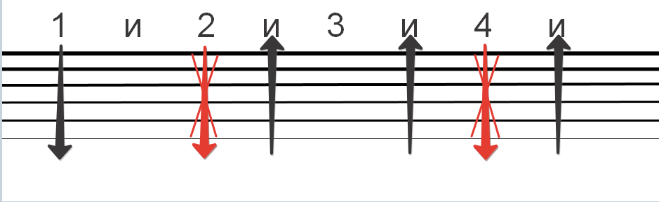 Надо про себя считать 1 и 2 и 3 и 4 и. На 1 удар вниз, на 2 вниз, на “и” после 2 вверх, на «и» после 3 вверх, на 4 вниз, на «и» после 4 вверх, далее опять на 1 вниз, и также дальше. Чтоб было проще разобраться посмотрите на схеме ниже! Стрелка вниз, означает удар по струнам сверху вниз, стрелка вверх-удар по струнам снизу вверх