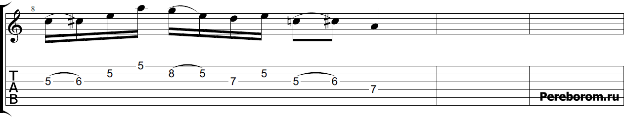 В нотах между обозначениями 4-го пальца есть небольшая прямая линия. Это означает перемещение пальца методом скольжения, не поднимая палец с лада: ноты ми — ре — до играть одним пальцем. На третьей доле такта на счет три поставить малое Барре 1-м пальцем на V ладу. Удерживайте малое Барре на протяжении следующих двух тактов, последовательно зажимая струну на VII (ноту си 3-м пальцем) и VIII (ноту до 4-м пальцем) ладах.