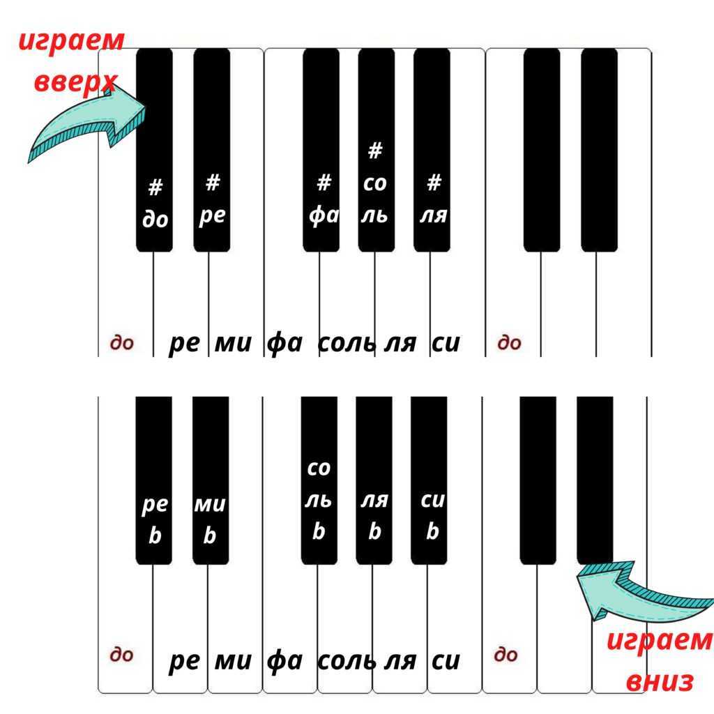 На клавиатуре таким образом считаем от любой белой или чёрной клавиши направо и налево, т. е. вверх и вниз. Закладываем не только представление о подсчёте интервалов (и аккордов) вверх и вниз (направо и налево):