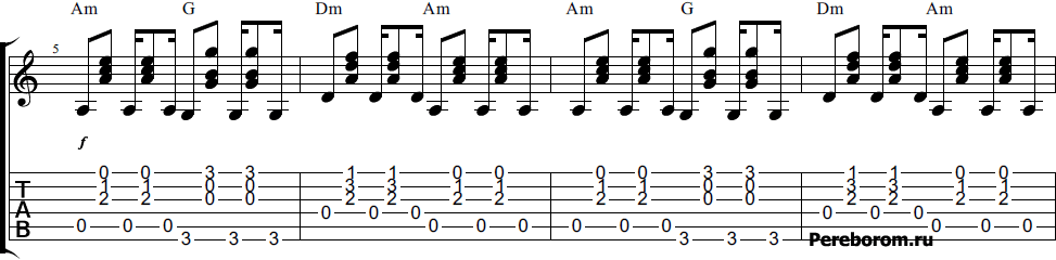 Вторая схема подойдет любителям играть на гитаре пальцами. Она отлично переходит из первого варианта боя, сама по себе очень простая, мелодичная, и открыта к изменениям, модуляциям, проставлением септаккордов и так далее.